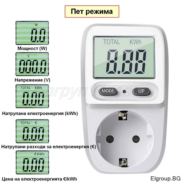 – Цифров LCD дисплей. Управлява се лесно чрез 2 бутона. Показва консумация на енергия (0,00 – 9 999,9 kWh). Отчита активна мощност (0,1 – 3680 W). Показва мрежово напрежение (200 – 276 V) и разходи за електроенергия (0,00 – 99,99 €).